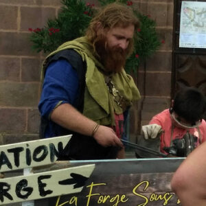 Membre de la Commanderie de Pyrène sous le nom de Nico de Bigorra, il appartient à une troupe qui a été pour nous un véritable mentor à nos tout débuts et qui le reste à ce jour. « Les Immaculés » au blanc tabard étincelant ont toujours été un contraste avec nous plutôt catalogués « Troupiers », aux armures cabossées et aux vêtements rouillés et rapiécés à cause d’années de combats. La Commanderie nous a transmis la rigueur, l’importance de l’accueil des visiteurs, les pratiques qui font la différence. Leurs compétences couvrent le martial et l’artisanat, avec notamment la fabrication de jeux en bois pour la transmission auprès des enfants, comme le parcours du jeune chevalier.