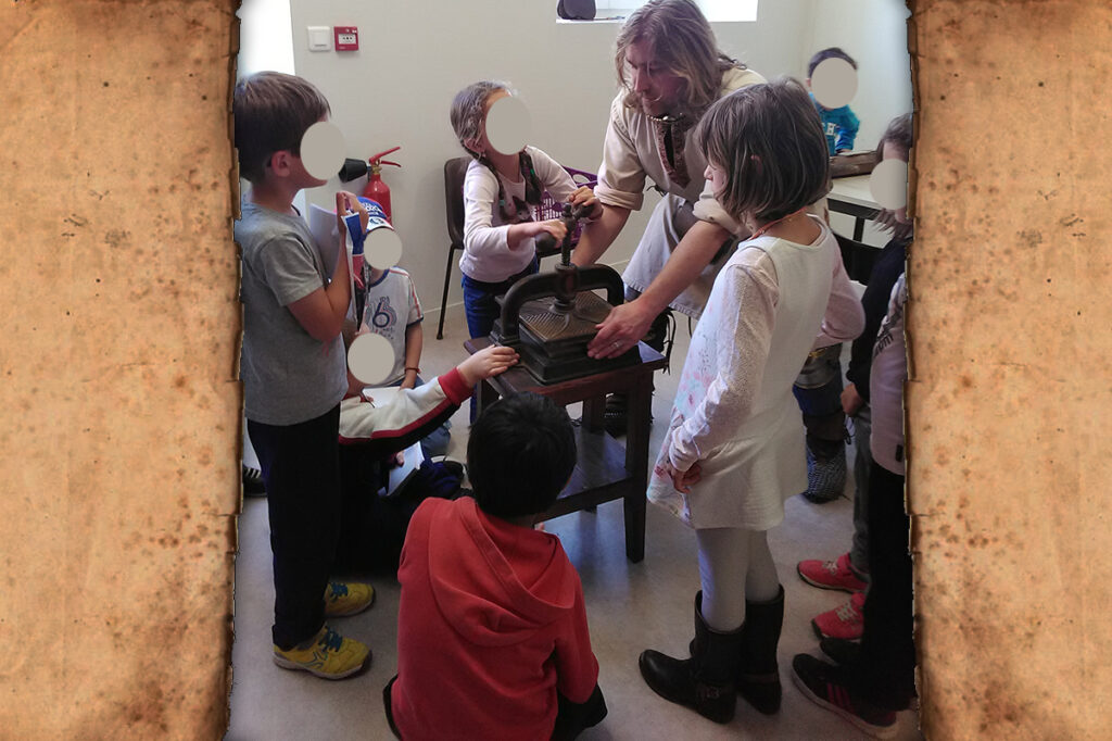 Les élèves découvrent comment coudre un livre, plier les feuilles avec une presse, installer la couverture selon les techniques d’époque.