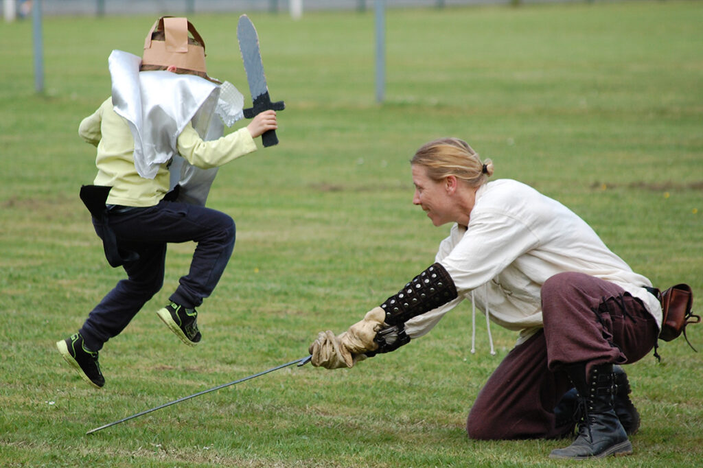 L’association adapte ses interventions à chaque contexte : ateliers d’initiation au maniement des armes pour le grand public, démonstrations de combat en armure, campements de guerre avec explications du quotidien médiéval.